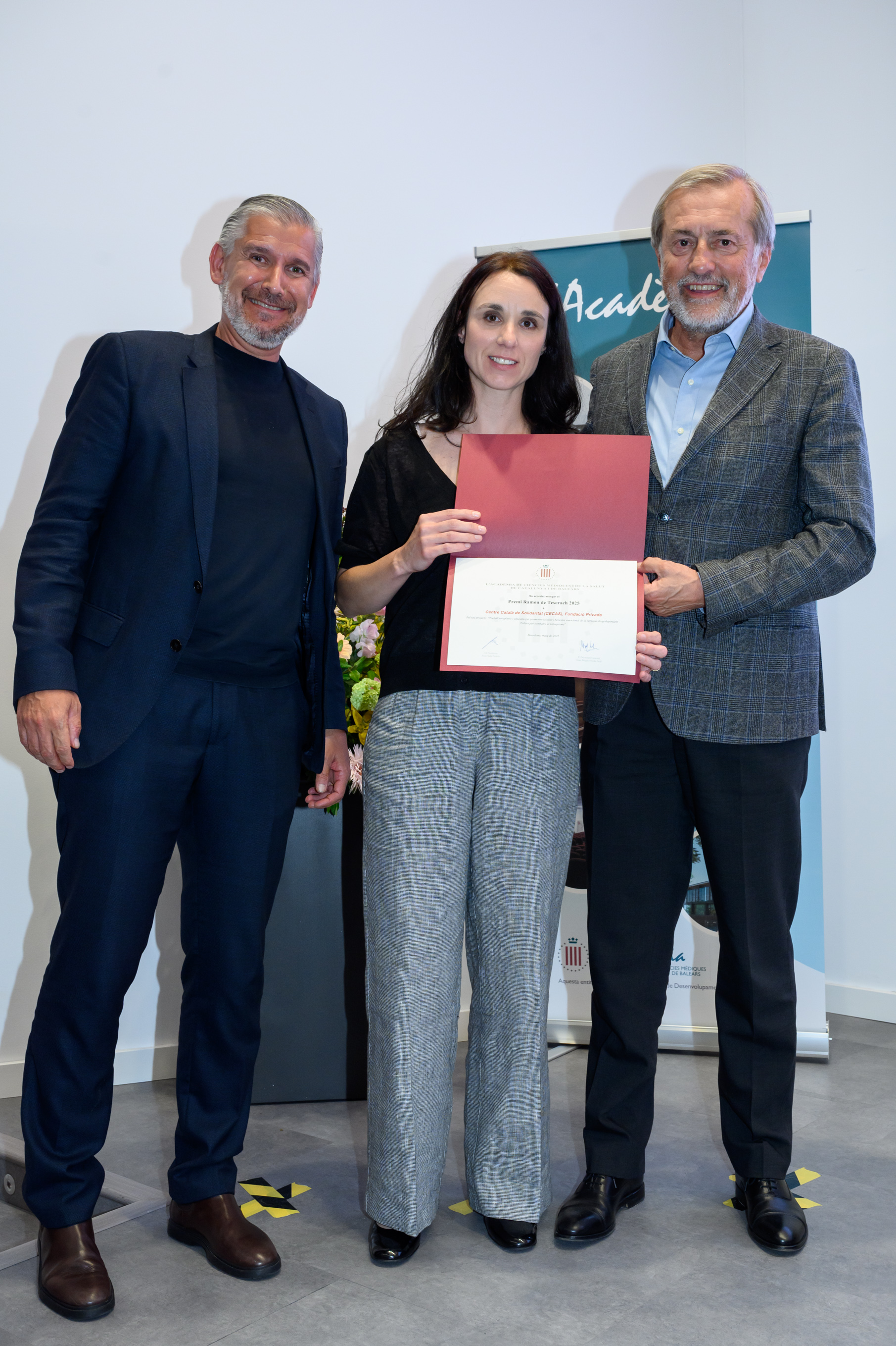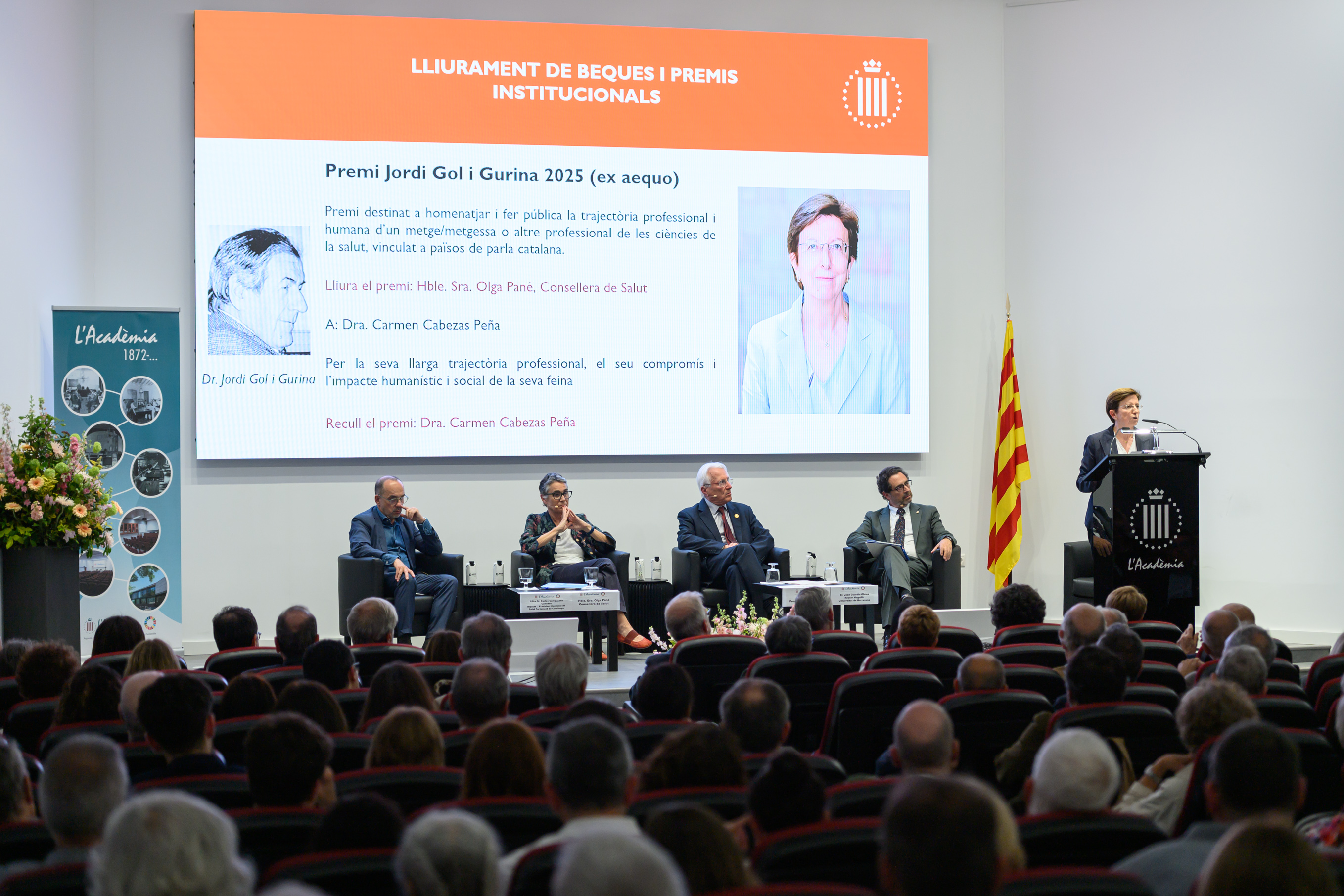 Lliuren els guardons el Dr. Joan Sala Pedrós, President de l’Acadèmia, l'Hble. Sra. Olga Pané Mena, Consellera de Salut; l'Il·ltre. Sr. Carles Campuzano Canadés, Diputat i President de la Comissió de Salut al Parlament de Catalunya; i el Dr. Joan Guàrdia Olmos, Rector Magnífic de la Universitat de Barcelona.